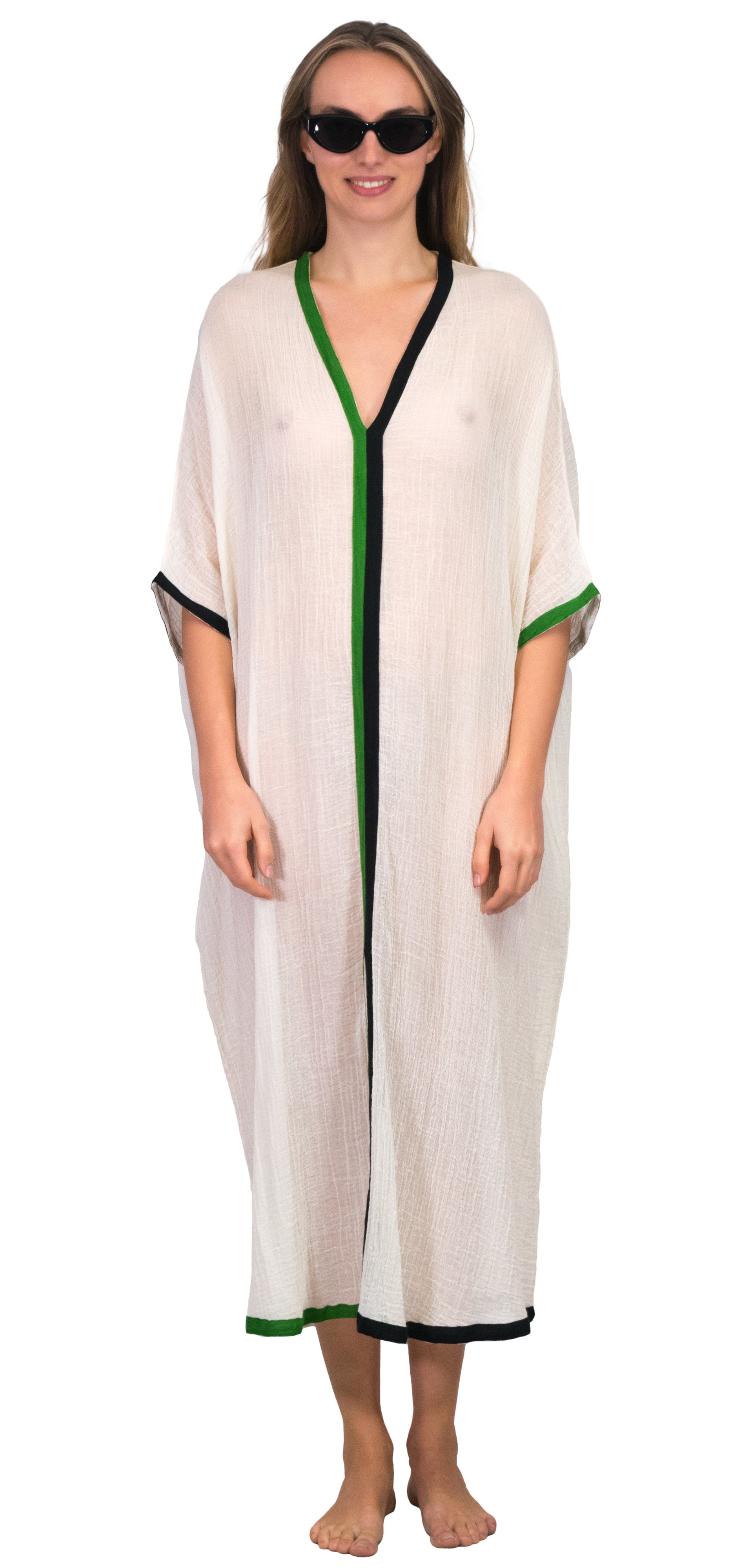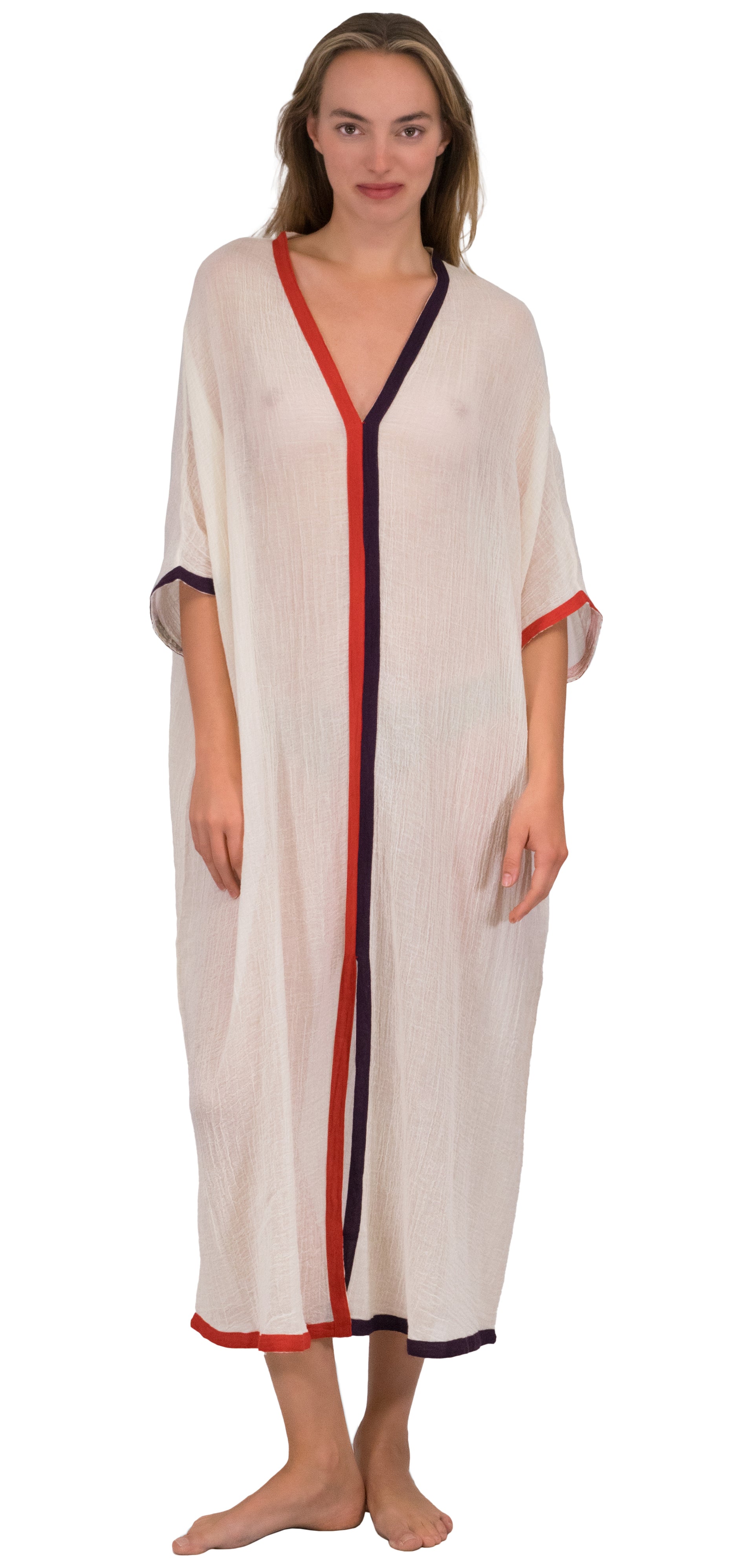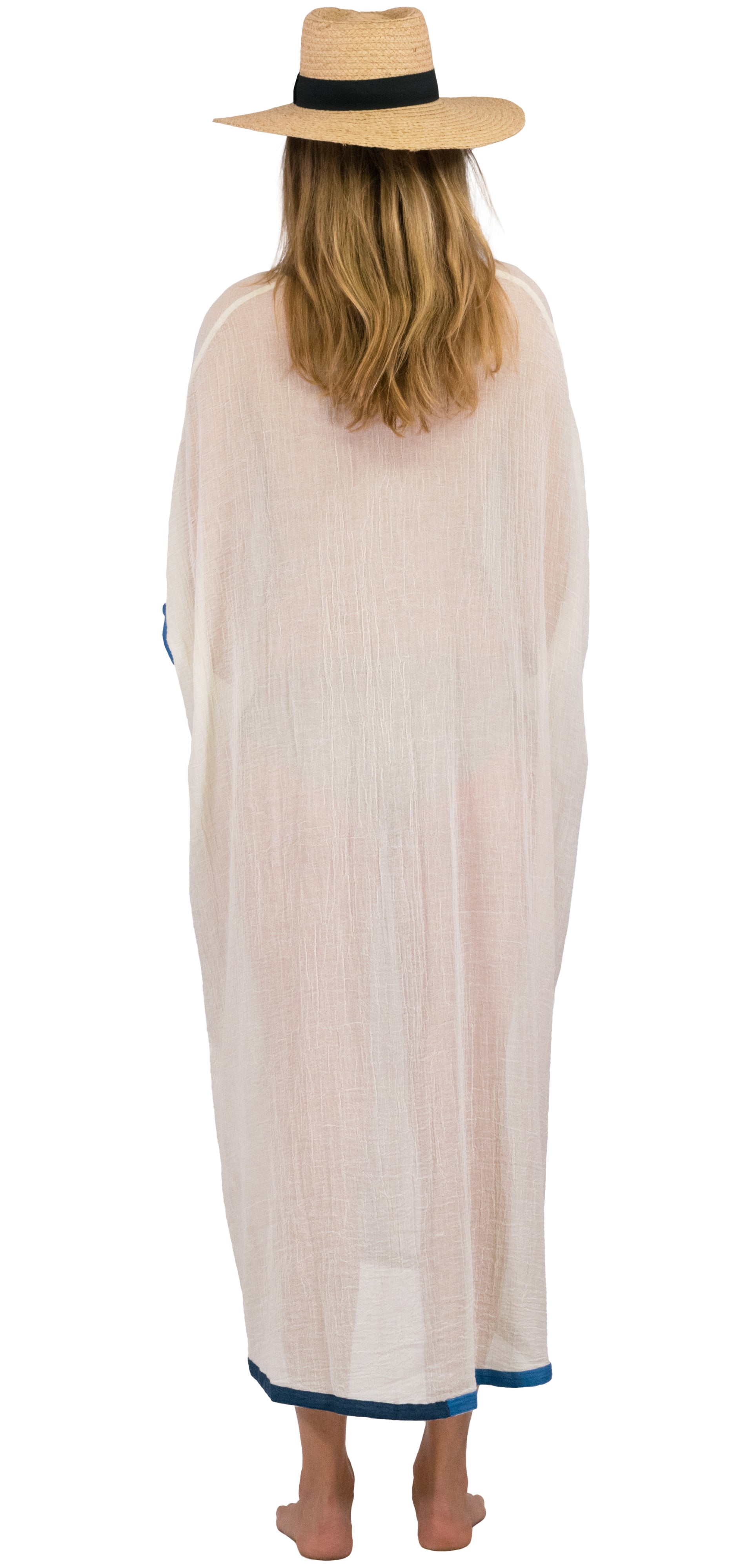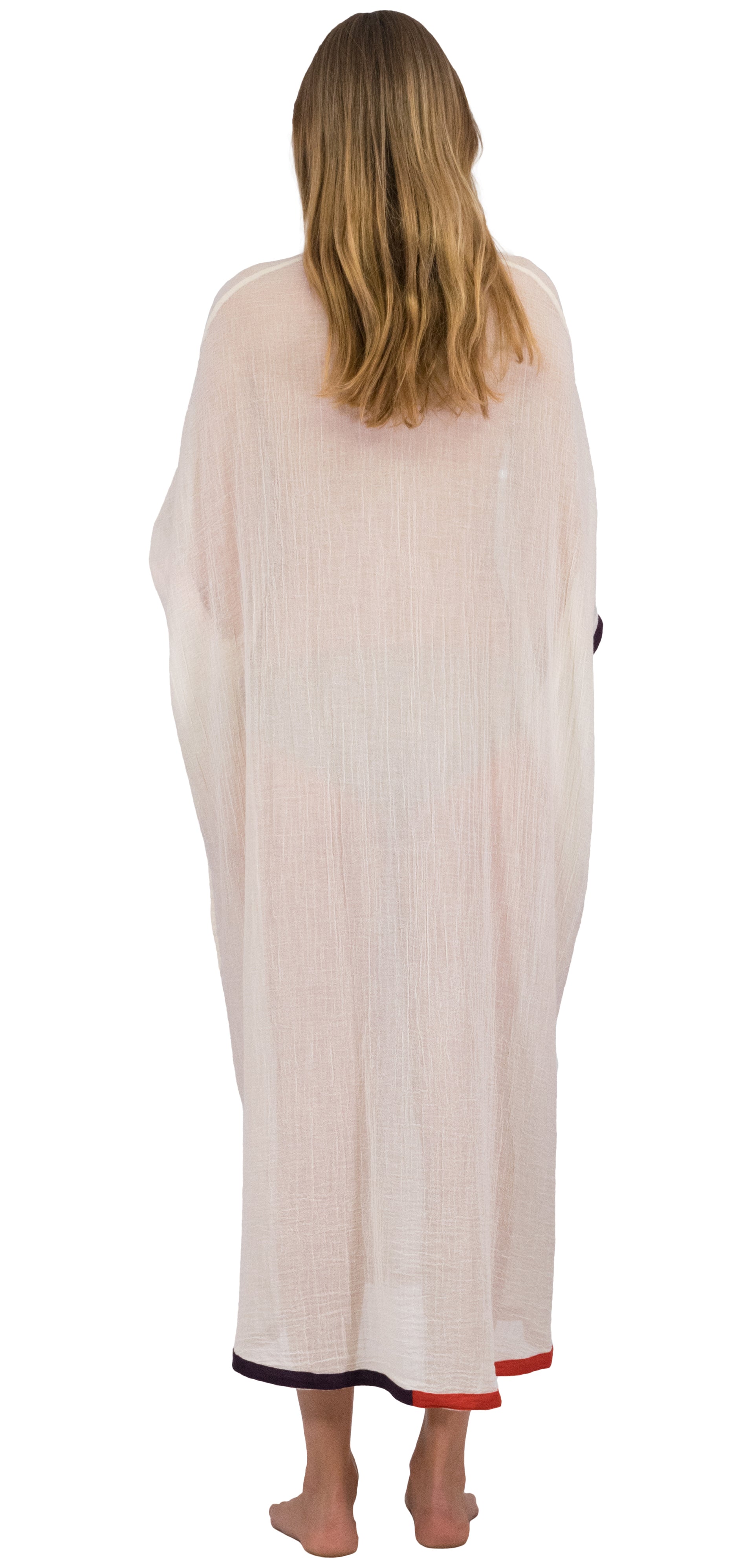 The Bee Tri Djellaba revisits our classic silhouette, edged with two contrasting tapes that frame the sides in refined color harmony. Light, fluid, and effortlessly chic, it’s the perfect piece to slip on over a swimsuit or wear through languid summer days.